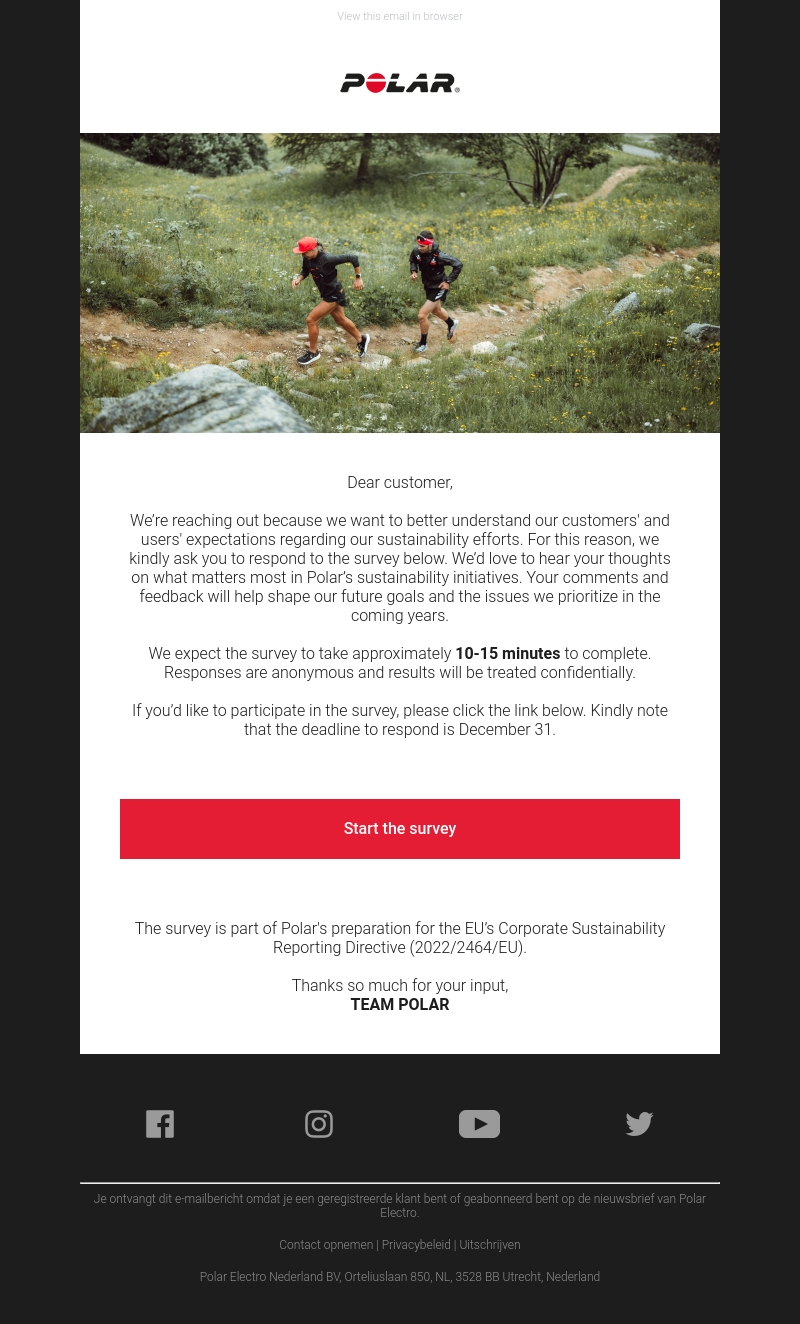 Polar nodigt je uit om deel te nemen aan hun duurzaamheidsenquête. Jouw feedback helpt ons de toekomst vorm te geven en prioriteiten te stellen voor belangrijke duurzaamheidsproblemen. De enquête duurt ongeveer 10-15 minuten en is volledig anoniem. Deelname kan tot 31 december. Doe mee en help ons verbeteren!
