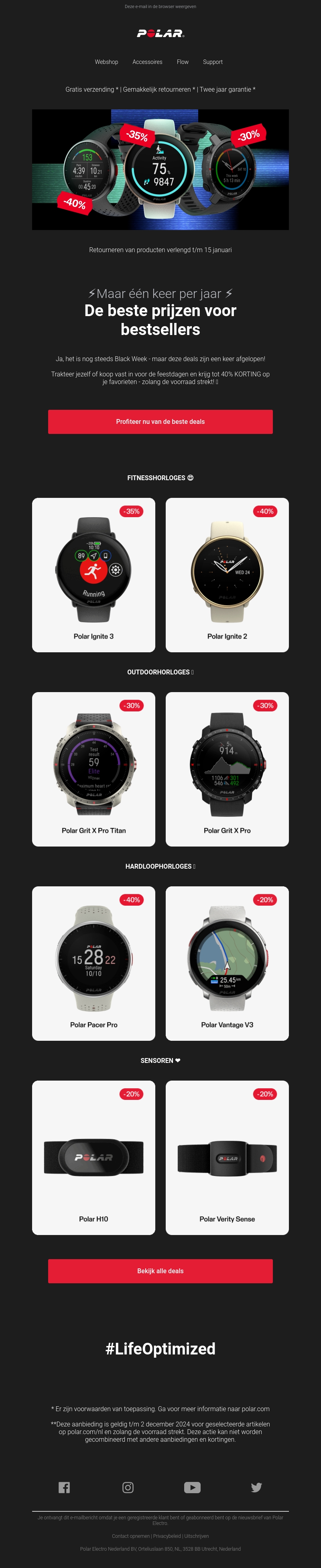 Mis deze kans niet tijdens de Black Week! Polar biedt tot 40% korting op hun bestsellers, inclusief fitness- en outdoorhorloges. Ontvang gratis verzending en profiteer van de beste prijzen van het jaar. De aanbieding geldt tot 2 december. Bezoek snel de site en kies jouw favoriete product.