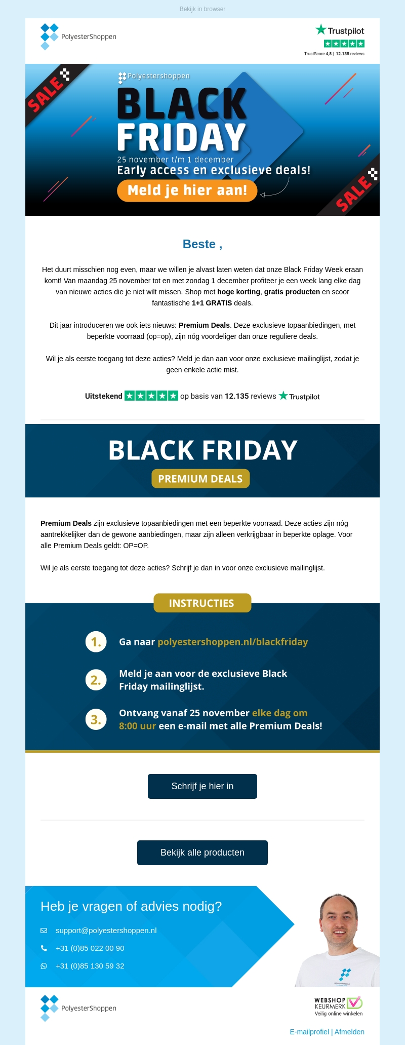 PolyesterShoppen nodigt je uit voor hun speciale Black Friday week. Van 25 november tot 1 december profiteer je van exclusieve aanbiedingen inclusief hoge kortingen en 1+1 gratis deals. Ontdek dit jaar ook de nieuwe Premium Deals voor nog voordeligere aanbiedingen. Meld je snel aan voor de exclusieve mailinglijst en mis geen enkele actie.