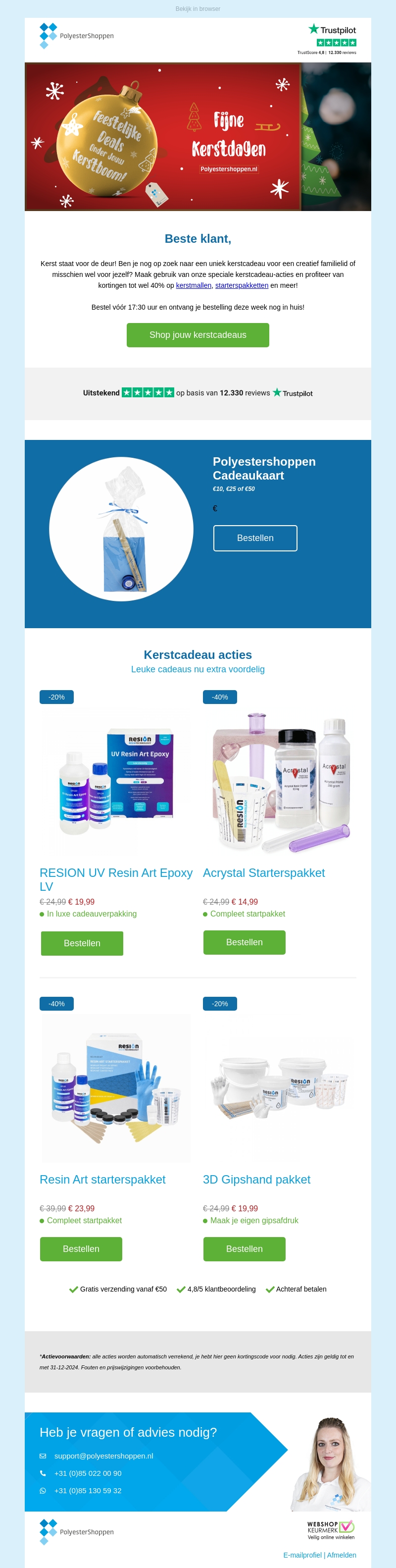De feestdagen staan voor de deur en PolyesterShoppen biedt unieke epoxy cadeaus voor een creatieve kerst! Ontdek onze speciale kerstkortingen tot wel 40% op een breed assortiment. Bestel voor 17:30 uur en ontvang je bestelling deze week nog thuis. Mis deze kans niet om je dierbaren te verrassen met iets bijzonders!
