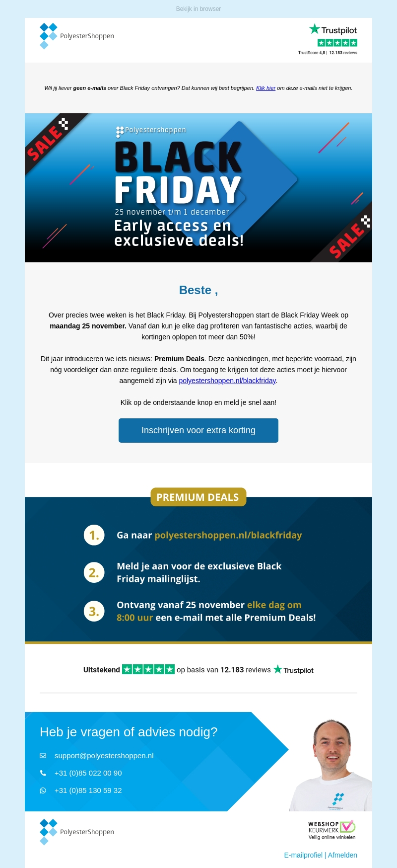Bij Polyestershoppen begint Black Friday op 25 november. Ontvang vroegtijdige toegang tot speciale Premium Deals met kortingen tot 50%. Schrijf je nu in en mis deze ongekende aanbiedingen niet.