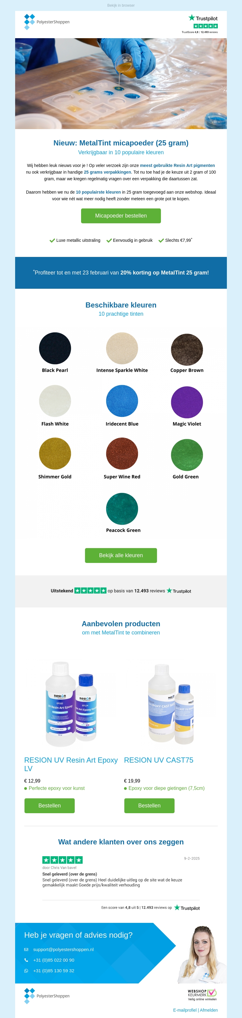 PolyesterShoppen introduceert het nieuwe MetalTint micapoeder, nu verkrijgbaar in 25 gram verpakkingen. Beschikbaar in 10 populaire kleuren, dit product is ideaal voor creatief gebruik. Bestel nu en ontvang 20% korting tot en met 23 februari. Combineer met RESION producten voor optimale resultaten. Lees klantbeoordelingen en bestel eenvoudig online.