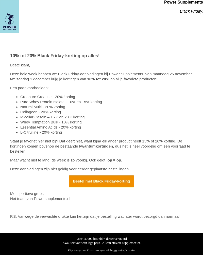 Ontdek de geweldige Black Friday-kortingen bij Power Supplements. Deze week kun je besparen tussen de 10% en 20% op producten zoals Creatine, Collageen en meer. Mis deze kans niet om je favoriete supplementen met korting in te slaan. De kortingen zijn geldig van 25 november tot 1 december. OP = OP!