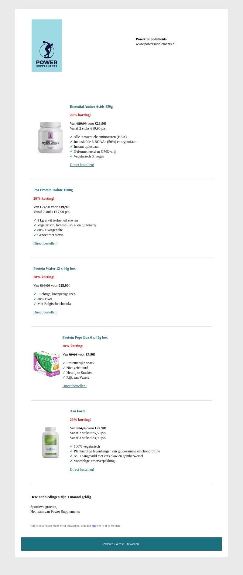 Oktober aanbiedingen: 5 x 20% korting - Natural Multi, Collageen, Pea Protein, Protein Wafer, Beta-Alanine