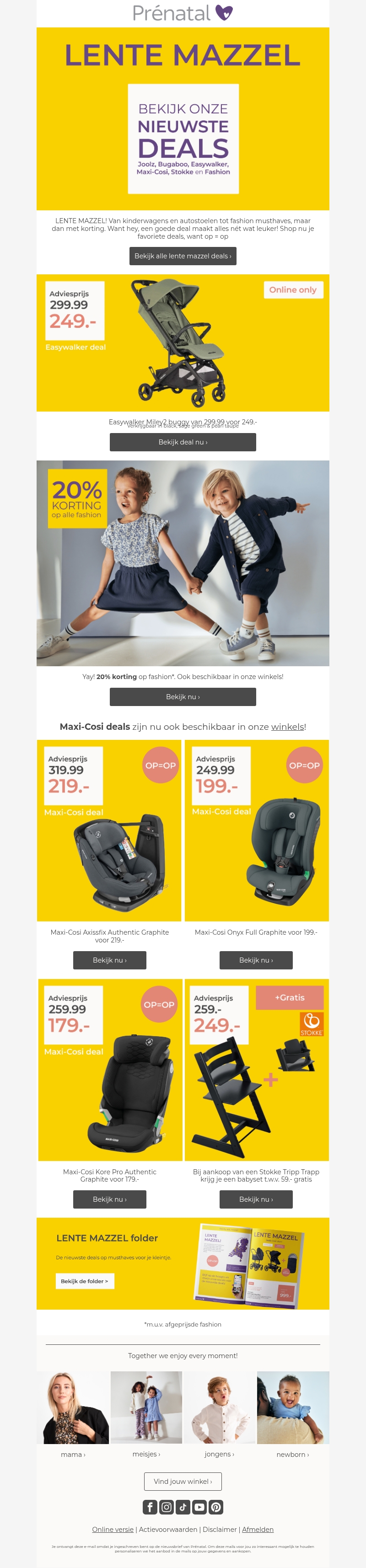 De lente is begonnen bij Prénatal met geweldige kortingen op kinderwagens, autostoelen en meer. Profiteer nu van de Easywalker Miley2 buggy met een exclusieve lente deal. Daarnaast vindt u ook indrukwekkende aanbiedingen op Maxi-Cosi autostoelen en fashion musthaves.