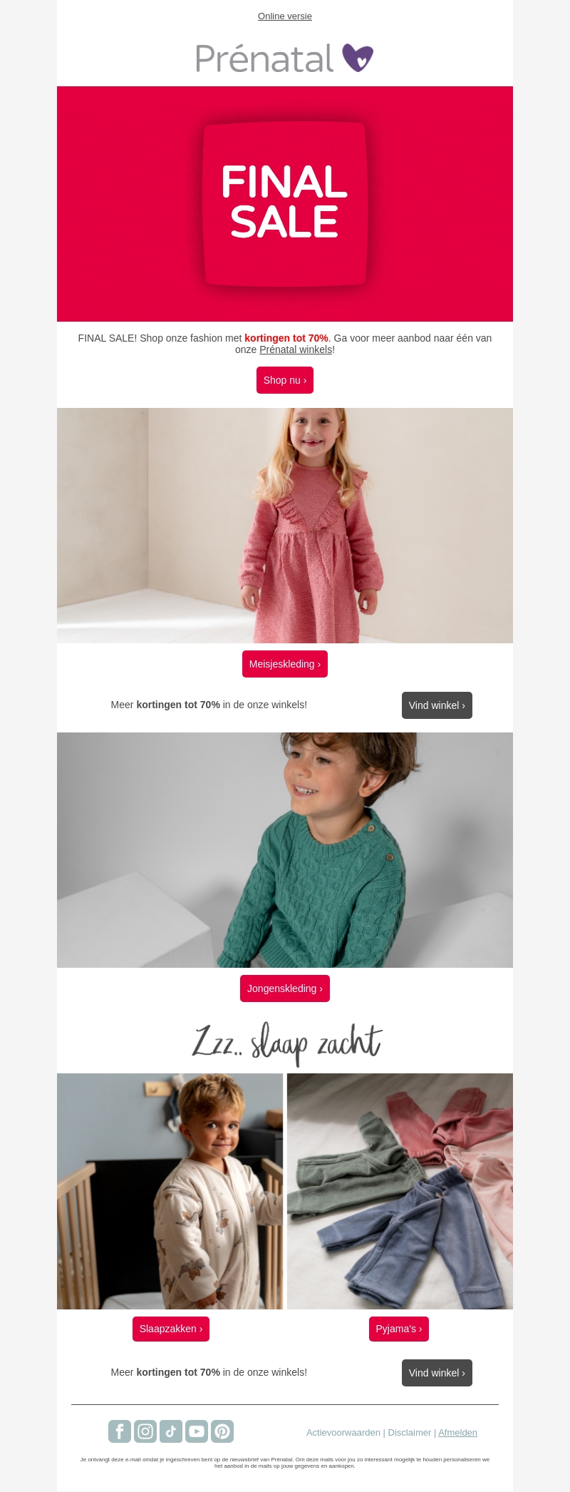 Mis de finale uitverkoop niet bij Prénatal! Geniet van kortingen tot 70% op een breed scala aan fashion items. Of je nu op zoek bent naar meisjes- of jongenskleding, slaapzakken of pyjama's, er is voor ieder wat wils. Bezoek onze winkels voor meer aanbiedingen en vernieuw je garderobe voor minder. Winkelen bij Prénatal was nog nooit zo voordelig!