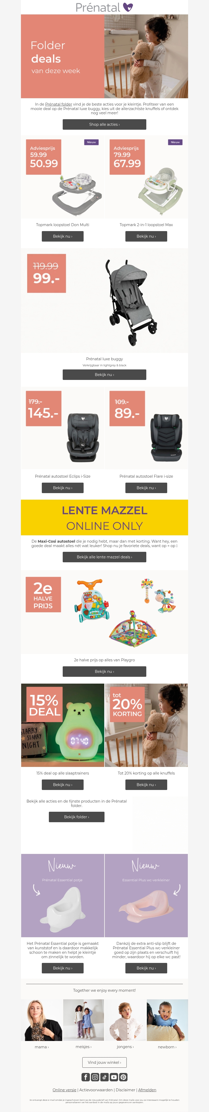 Verken de nieuwste Prénatal folder met geweldige aanbiedingen op essentiële kinderproducten. Van kinderwagens tot autostoelen en speelgoed, profiteer van aantrekkelijke kortingen deze week. Bekijk de 15% deal op slaaptrainers of scoor tot 20% korting op knuffels. Mis deze kans niet om de beste artikelen voor je kleintje te bemachtigen. Shop vandaag nog bij Prénatal!