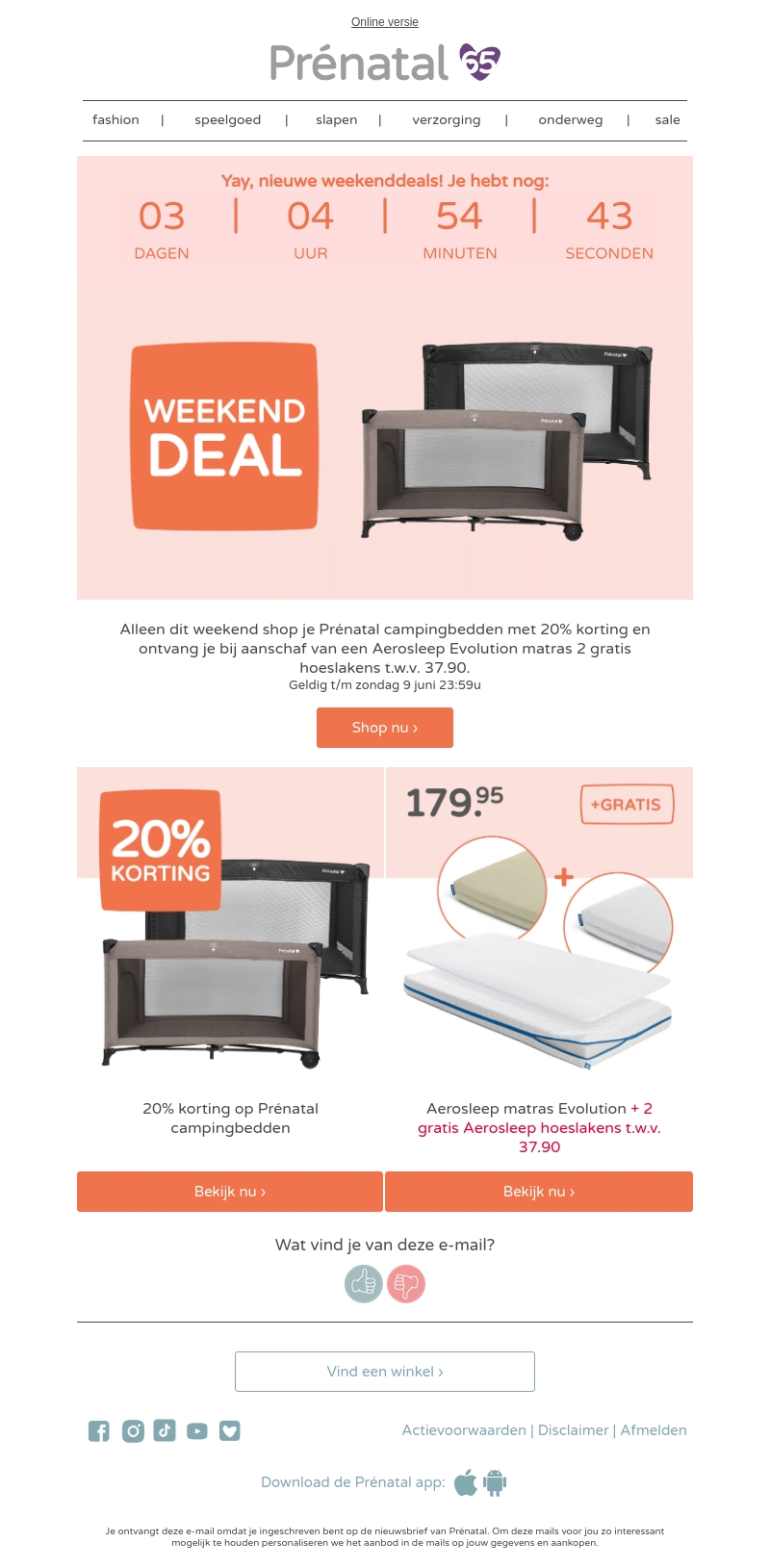 Profiteer alleen dit weekend van 20% korting op Prénatal campingbedden en ontvang bij aanschaf gratis Aerosleep Evolution matrashoeslakens t.w.v. €37,90. Geldig t/m zondag 9 juni 23:59. Shop nu bij Prénatal!