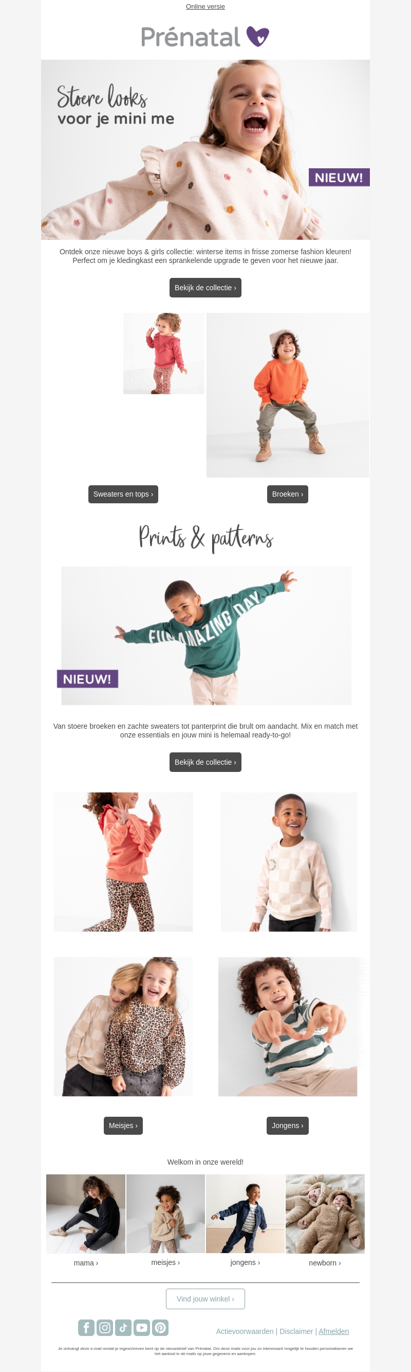 Duik in de nieuwste boys & girls collectie bij Prénatal. Ontdek winterse items in frisse zomerse kleuren. Van stoere broeken en zachte sweaters tot panterprintjes – perfect voor de garderobe van je kleintje. Voeg wat sprankeling toe aan hun dagelijks leven met onze stijlvolle en comfortabele kledingopties. Mix en match de essentials voor een complete look.