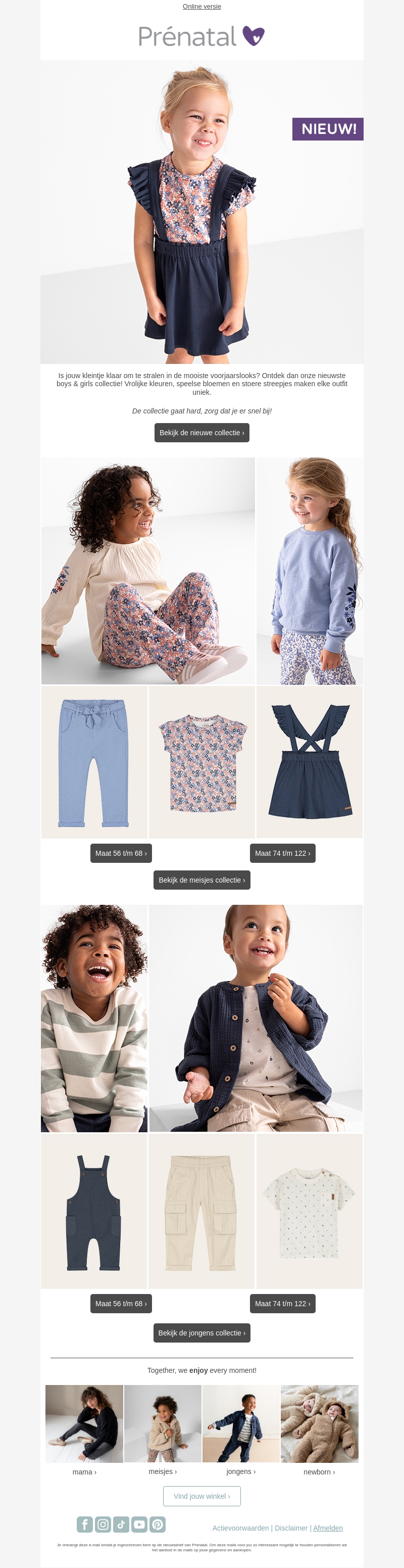 Prénatal presenteert de nieuwe voorjaarscollectie voor kinderen. Ontdek vrolijke kleuren, speelse bloemen en stoere strepen die elke outfit opfrissen. Kies uit verschillende stijlen en maten voor jongens en meisjes. Zorg dat je er snel bij bent, want de collectie is populair! Bekijk nu de nieuwste trends bij Prénatal.