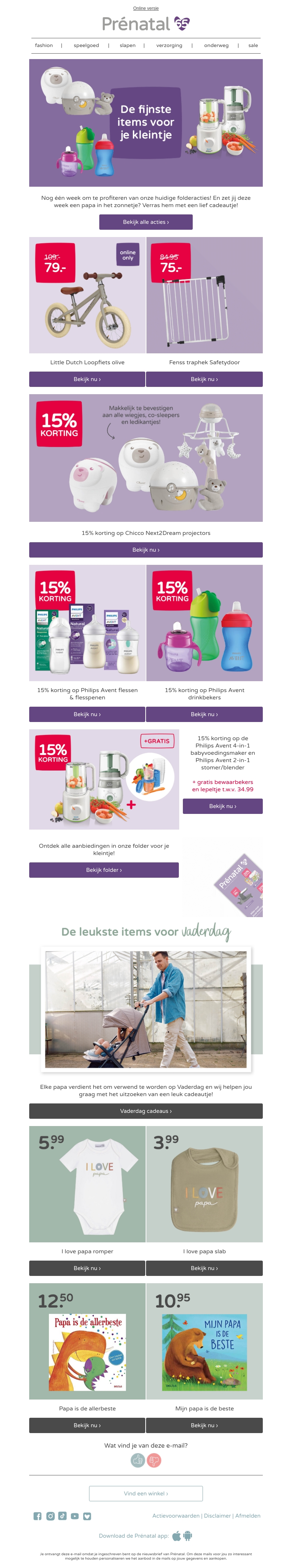 Profiteer deze week van geweldige aanbiedingen op producten voor je kleintje bij Prénatal. Van loopfietsen tot slaapprojectoren en drinkbekers, alles met aantrekkelijke kortingen. Vergeet ook niet onze Vaderdag cadeautips te bekijken!