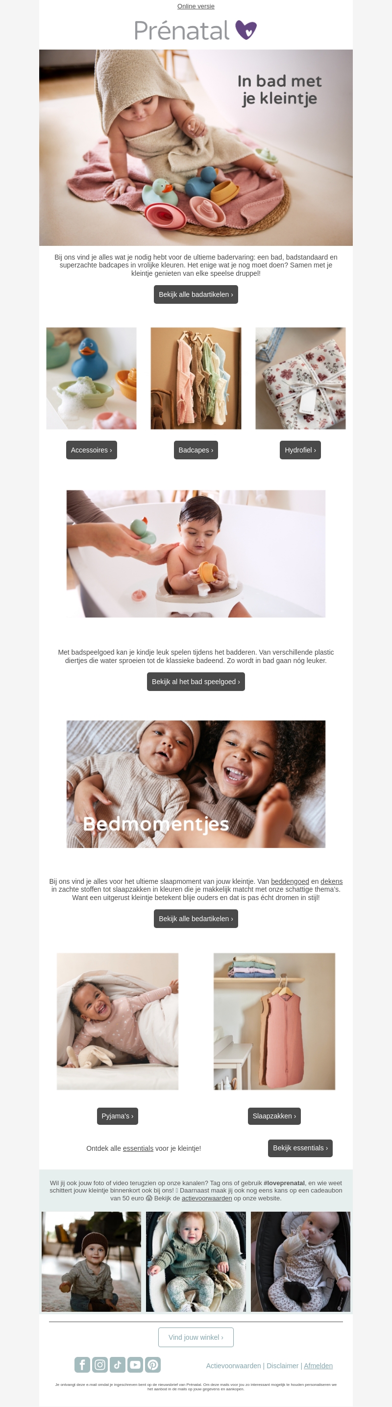 Bij Prénatal vind je alles wat je nodig hebt voor de ultieme bad- en bedervaring voor je kleintje. Van kleurrijke badaccessoires en zachte badcapes tot slaapzakken en beddengoed in trendy tinten. Maak van ieder moment een feestje met onze kwalitatieve producten.