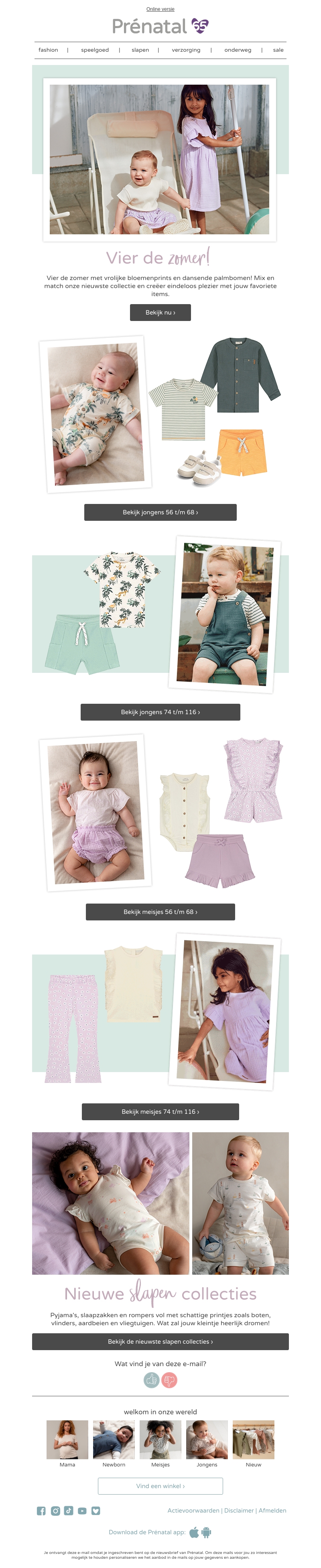 Vier de zomer met de nieuwste collectie van Prénatal, gevuld met vrolijke bloemenprints en dansende palmbomen. Mix en match onze nieuwste items voor eindeloos plezier. Ontdek de prachtige outfits voor jongens en meisjes, en laat jouw kleintje de zomer in stijl vieren.