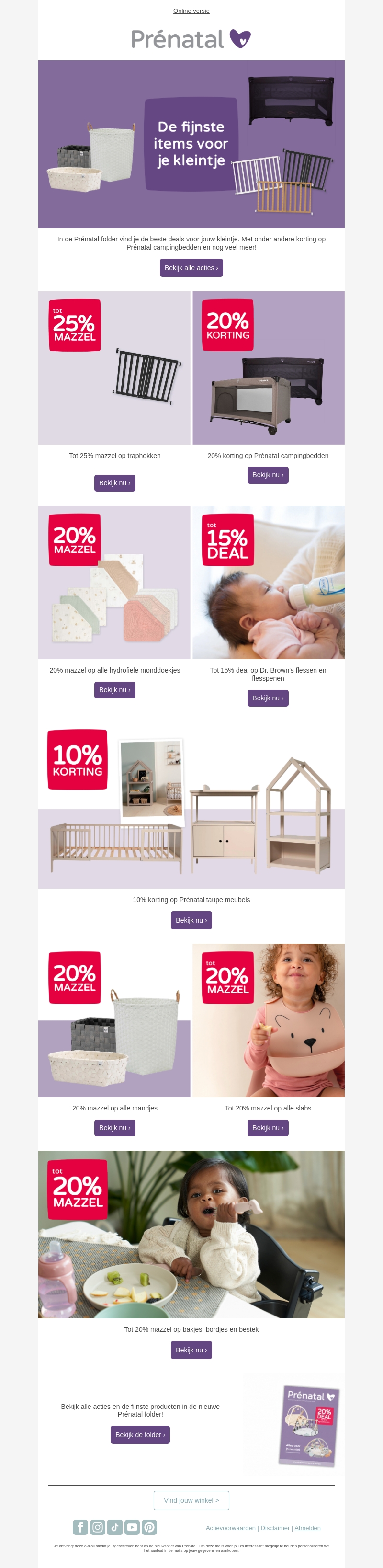 Deze week biedt Prénatal geweldige kortingen voor jouw kleintje. Profiteer van tot wel 25% korting op traphekken en 20% korting op campingbedden. Daarnaast zijn er mooie deals op hydrofiele doeken, flessen en meer. Ontdek veelzijdige kortingen zodat je alles in huis hebt voor je baby. Bekijk snel alle aanbiedingen in de nieuwste Prénatal folder.