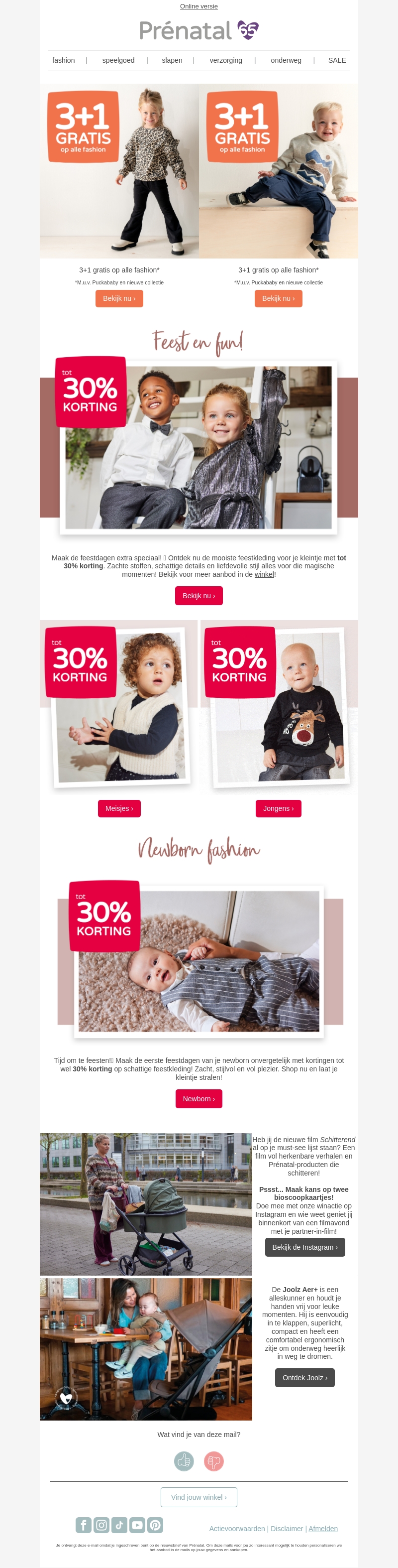 Profiteer nu van de fantastische 3+1 gratis aanbieding op alle mode bij Prénatal. Verwen je kleintje met de nieuwste collecties en stijlvolle kleding. Kies uit feestelijke outfits met tot 30% korting. Shop voor baby's, meisjes en jongens en bespaar groots.