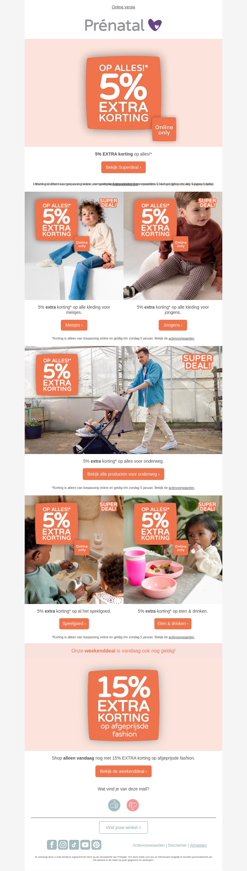 Prénatal biedt een fantastische korting van 5% op alle artikelen! Of je nu op zoek bent naar kleding voor meisjes en jongens, producten voor onderweg, speelgoed of eten & drinken, er is voor ieder wat wils. Mis deze online exclusieve kans niet, geldig tot en met 5 januari. Bezoek vandaag nog de Prénatal webshop en bespaar op al je aankopen. Daarnaast is er een speciale weekenddeal met 15% korting op afgeprijsde mode.