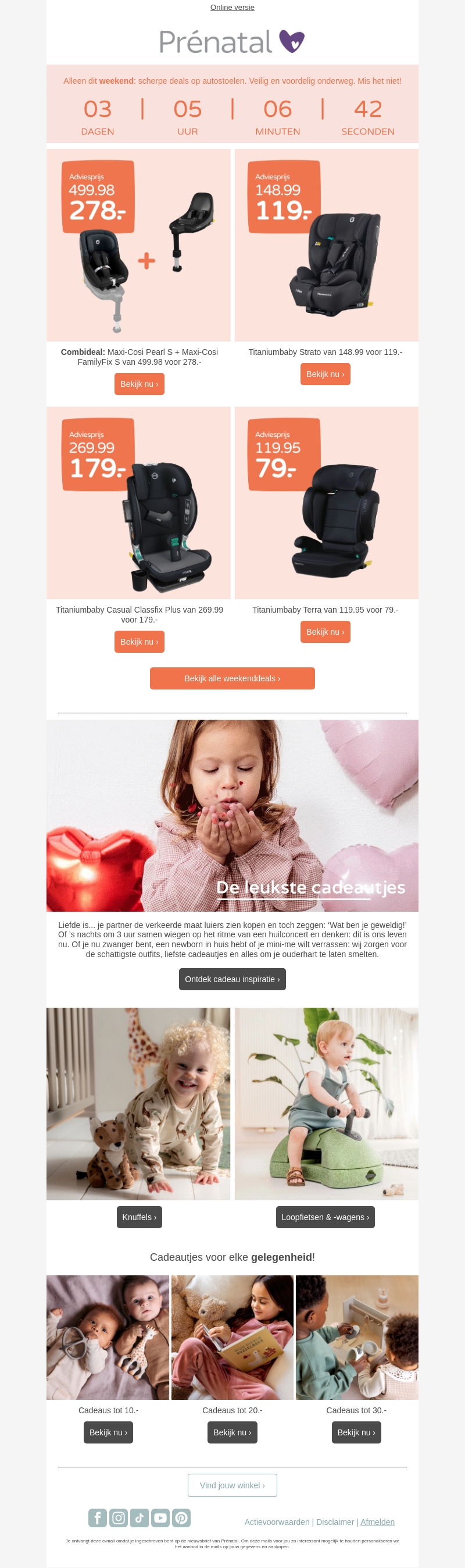 Deze nieuwsbrief van Prénatal biedt geweldige weekenddeals op autostoelen. Ontdek nu de speciale kortingen zoals de Maxi-Cosi Pearl S Plus met Maxi-Cosi FamilyFix voor slechts 278,-. Daarnaast zijn er aanbiedingen op de Titaniumbaby Strato en Terra modellen. Mis deze kans niet om veilig en voordelig onderweg te zijn met je kleintje. Bekijk ook de leukste cadeautjes voor elke gelegenheid en laat je inspireren!