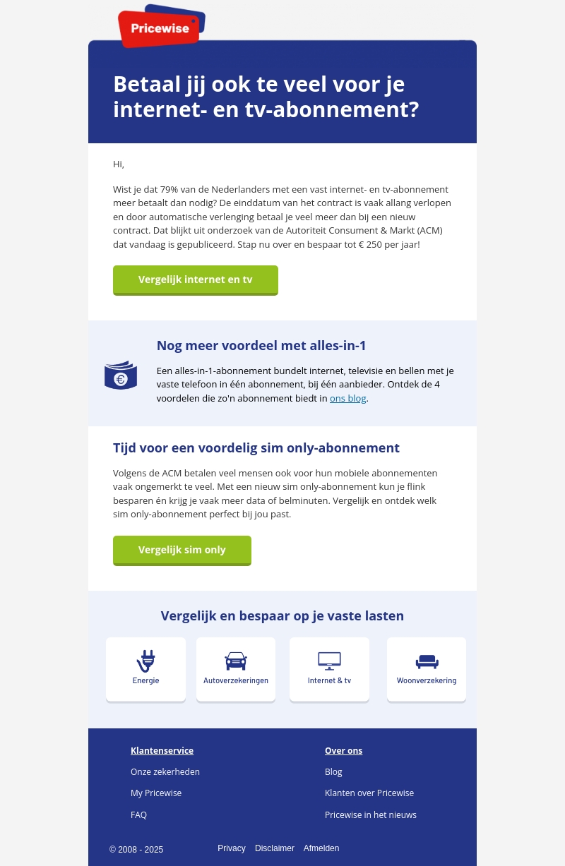 Veel Nederlanders betalen te veel voor hun internet- en tv-abonnement door contractverlenging. U kunt tot €250 besparen per jaar door over te stappen naar een nieuw contract. Bovendien biedt een alles-in-1-abonnement extra voordelen door internet, tv en bellen te bundelen. Vergelijk ook sim only-abonnementen om op mobiele kosten te besparen.