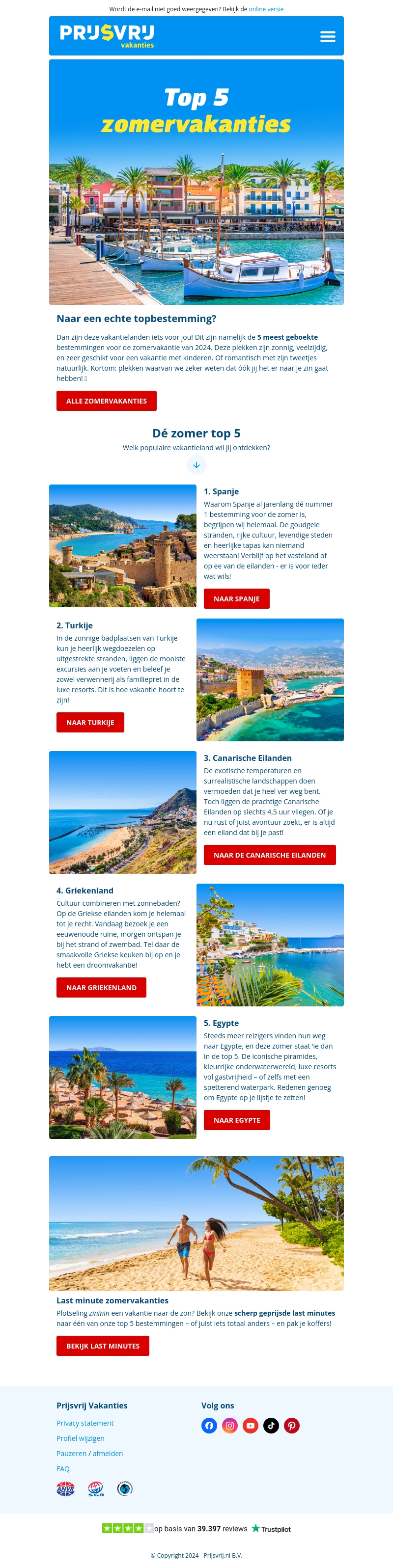 Ga op vakantie naar de top 5 zomervakantiebestemmingen van 2024. Van Spanje tot Egypte, ontdek de mooiste plekken om te ontspannen, avontuur te beleven en te genieten van de zon.