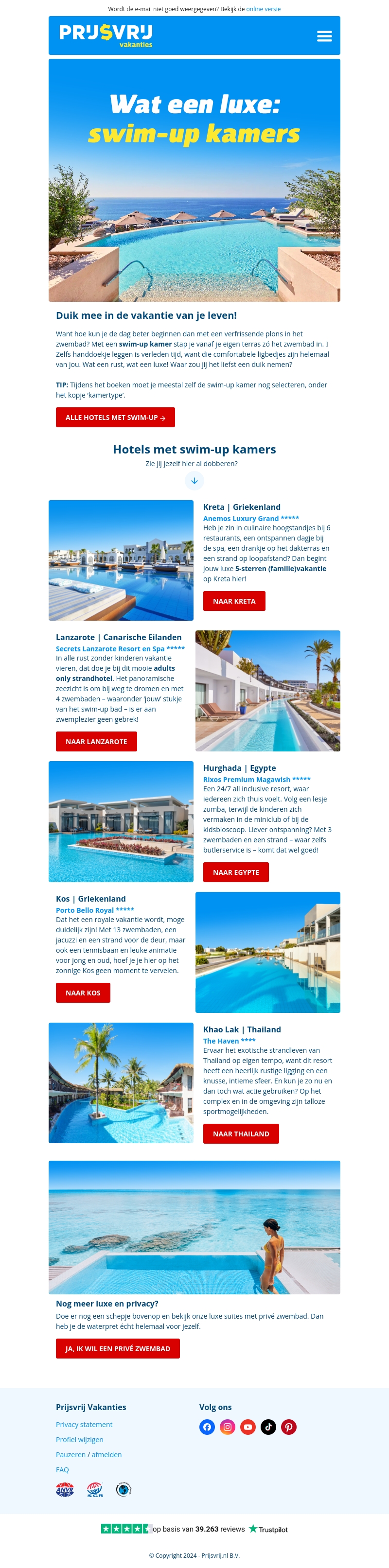 Duik mee in de vakantie van je leven met onze swim-up kamers. Ontdek ons aanbod aan luxe accommodaties in Kreta, Lanzarote, Hurghada en meer. Reserveer nu en geniet van ongeëvenaard comfort en privacy.
