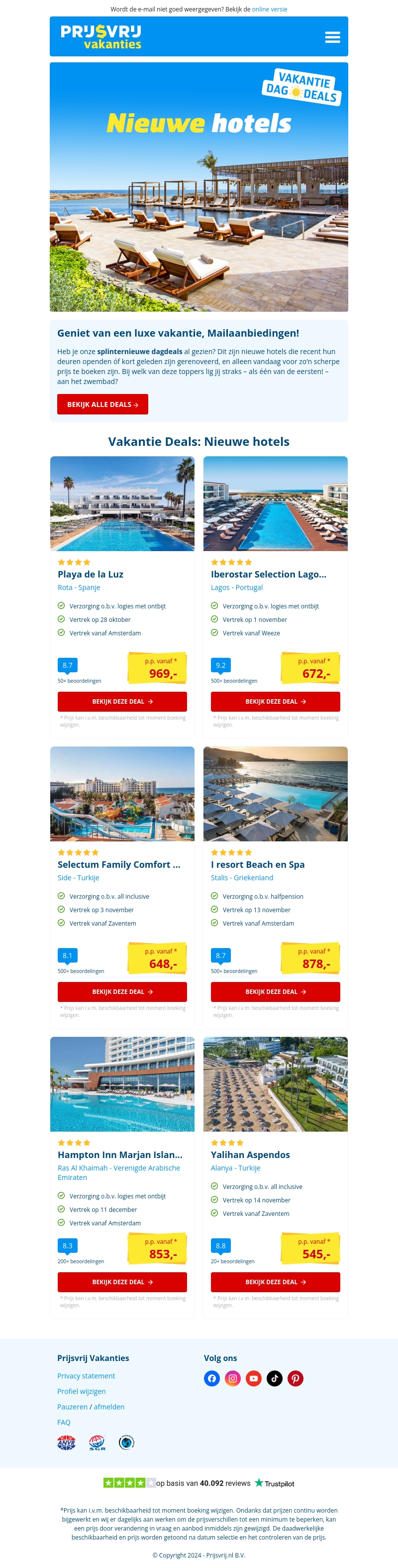 Ontdek de nieuwste hotels die net hun deuren hebben geopend! Prijsvrij Vakanties biedt exclusieve dagdeals voor deze bestemmingen. Van Spanje tot Turkije, geniet van scherpe prijzen en luxe accommodaties. Boek snel en ervaar een onvergetelijke vakantie. Bekijk alle actuele aanbiedingen en bespaar op je volgende reis!
