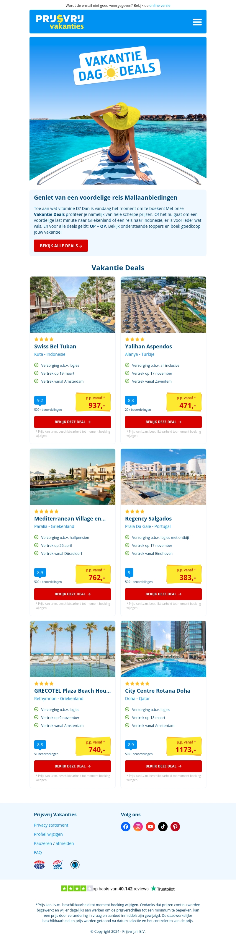 Beleef je droomvakantie met onze Vakantie Dag Deals van Prijsvrij. Geniet van geweldige aanbiedingen naar bestemmingen zoals Griekenland, Turkije en Qatar. Neem een pauze van de dagelijkse sleur en verwen jezelf met een welverdiende reis. Boek nu met onze scherpe prijzen en pak je koffers voor een avontuurlijke ontsnapping. Vergeet niet, op is op! Bekijk snel de beste deals en maak je dromen waar.