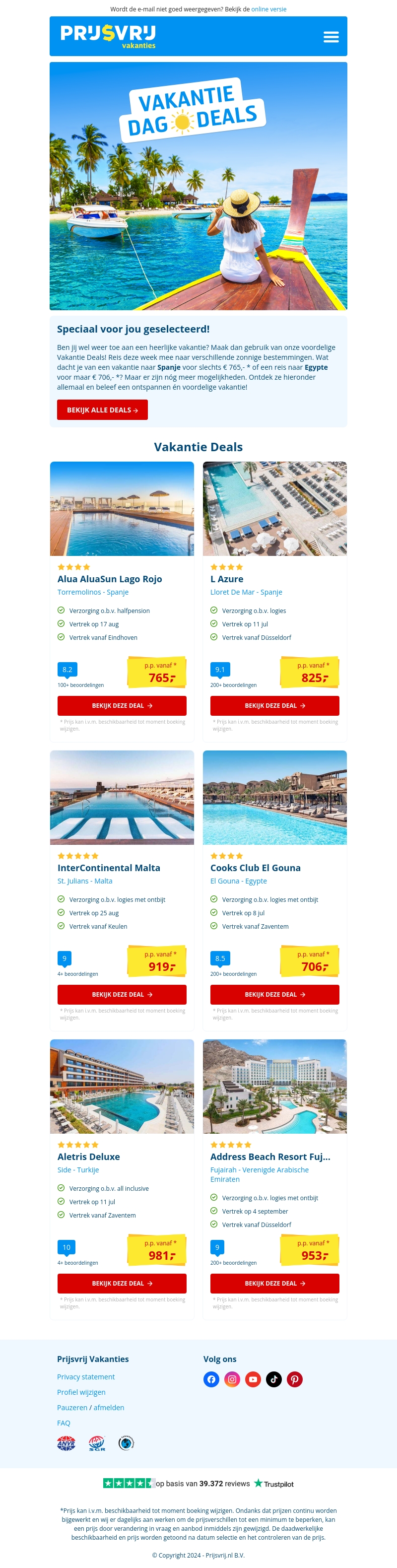 Ben jij toe aan een heerlijke vakantie? Bekijk onze voordelige vakantiedeals speciaal voor jou geselecteerd! Reis naar Spanje, Egypte, Malta, en meer tegen scherpe prijzen. Wacht niet te lang, deze aanbiedingen zijn beperkt beschikbaar.