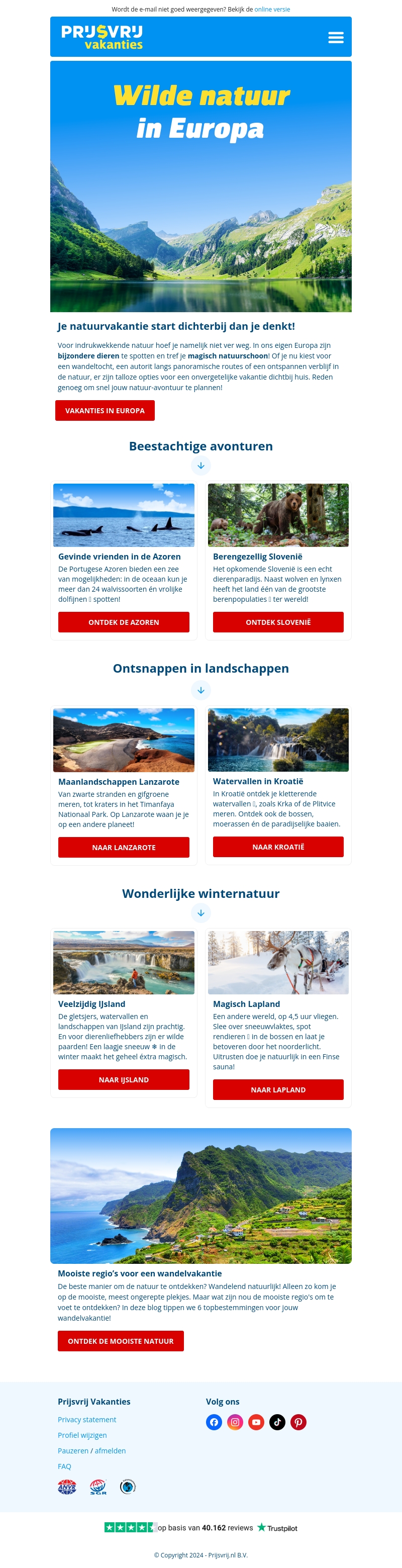 Duik in de indrukwekkende natuur van Europa met onze spannende reizen. Spot dolfijnen in de Azoren, verken de wildernis van Slovenië, en bewonder de adembenemende landschappen van IJsland en Lapland. Ontspan tijdens een wandelvakantie door de mooiste regio's. Begin je avontuur vandaag!