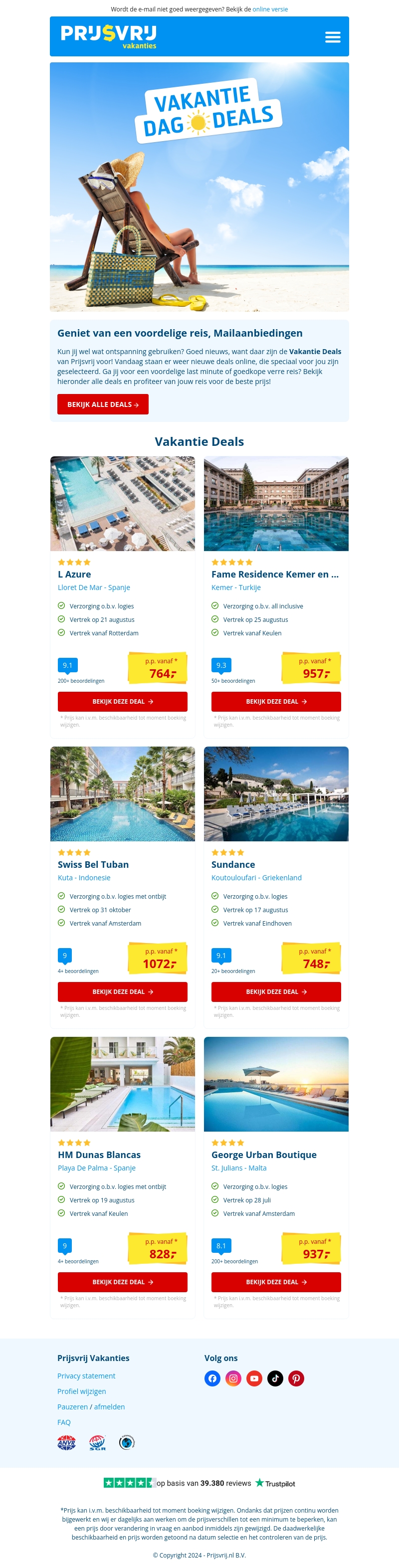 Geniet van de nieuwste vakantie deals van Prijsvrij! Of u nu droomt van een zonvakantie in Spanje of een relax verblijf in Turkije, wij hebben de perfecte aanbieding voor u. Plan vandaag uw volgende onvergetelijke vakantie en bespaar.