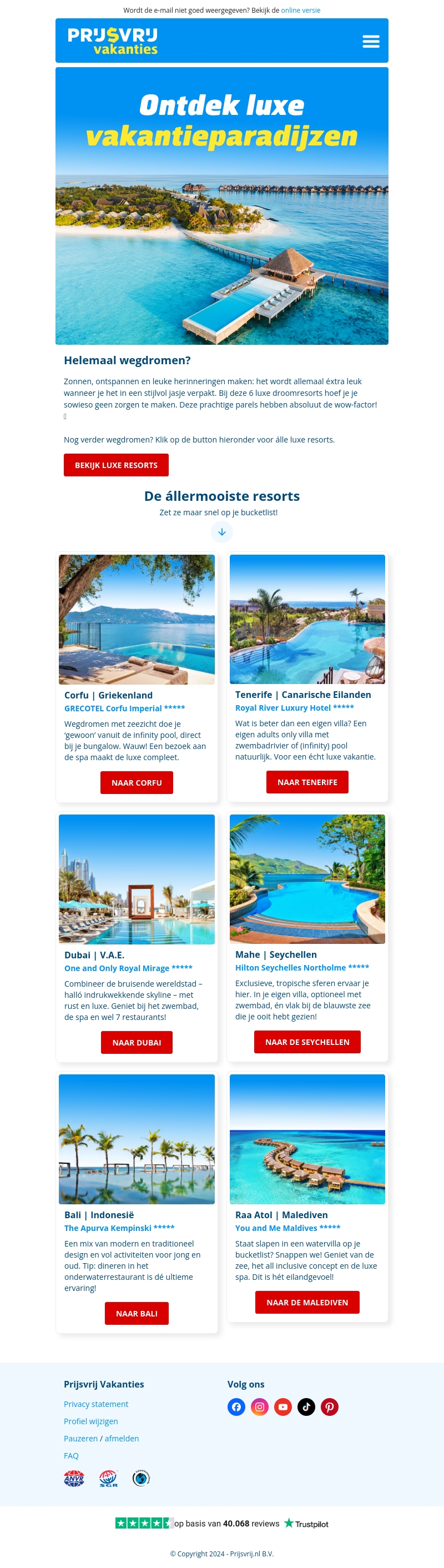 Droom weg bij de mooiste luxe resorts ter wereld. Van idyllische stranden in de Seychellen tot moderne oases in Dubai, ieder resort biedt een unieke ervaring vol comfort en verwennerij. Laat je inspireren door de wow-factor van deze paradijselijke bestemmingen. Vergeet de drukte en geniet van rust, luxe en prachtige uitzichten. Boek nu en maak van je vakantie een onvergetelijke belevenis.