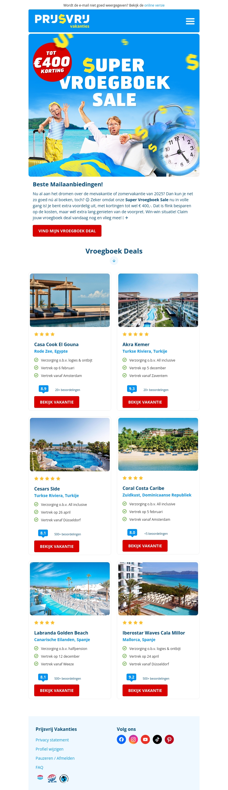 Ontdek onze Super Vroegboek Sale en bespaar tot € 400 op je volgende vakantie! Geniet van geweldige vakantiedeals naar topbestemmingen. Boek nu en profiteer van de beste prijzen voor je zomervakantie in 2025. Wacht niet langer en claim je vroegboek korting vandaag nog!