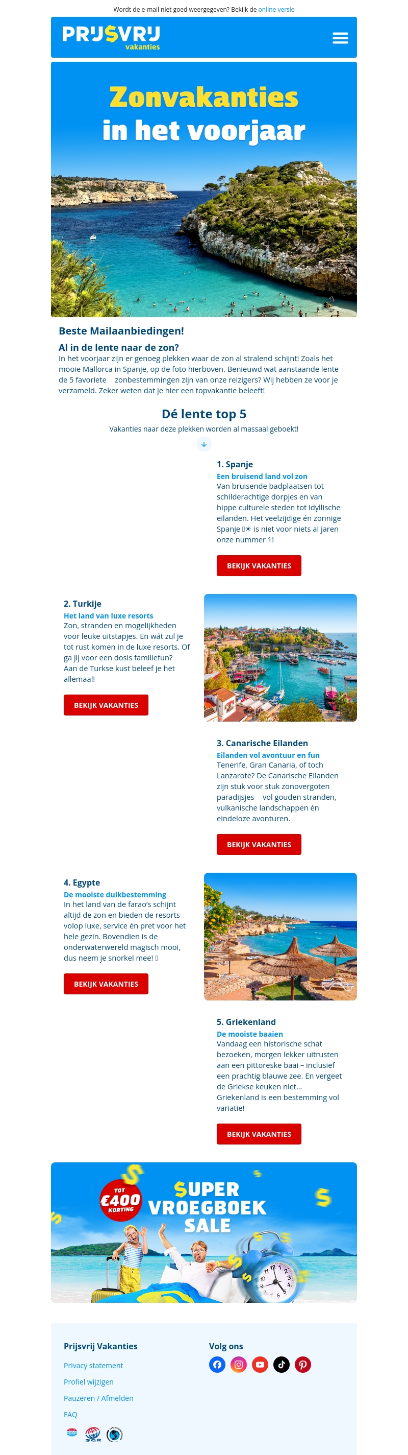 Bereid je voor op het voorjaar met onze top 5 zonvakanties. Van Spanje's bruisende stranden tot de luxe van Turkije's resorts, er is voor ieder wat wils. Bezoek de Canarische Eilanden voor avontuur, duik in de wateren van Egypte of geniet van Griekenland's prachtige baaien. Boek nu je droomvakantie!