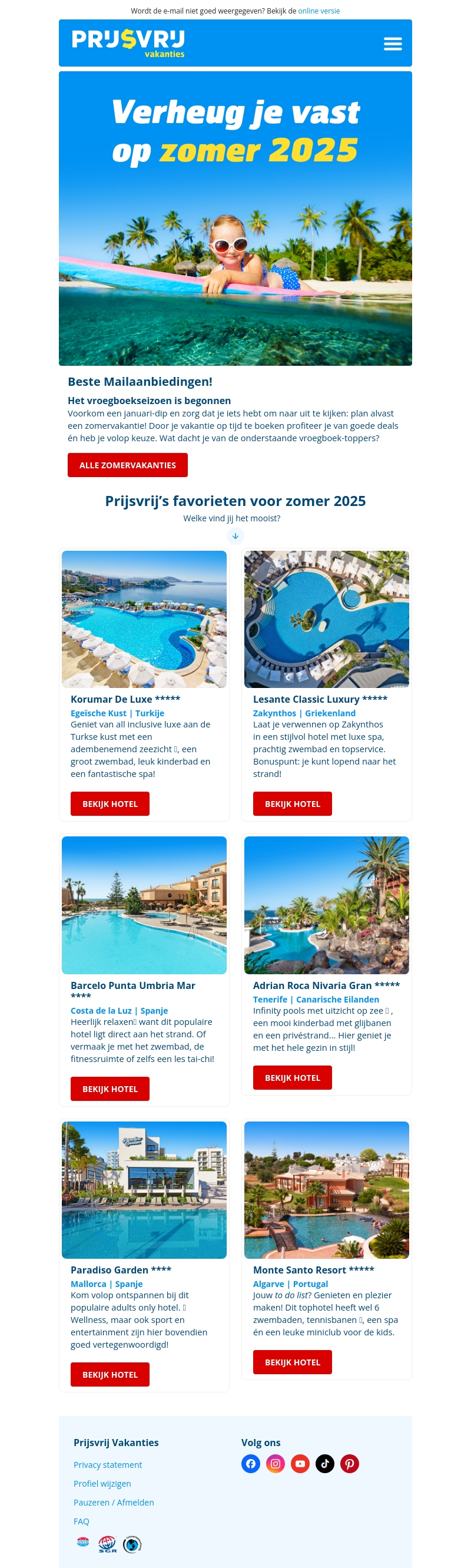 De zomer van 2025 lijkt misschien ver weg, maar het is de perfecte tijd om je vakantieplannen te maken! Ontdek de topdeals van PrijsVrij vakanties, variërend van luxe resorts in Griekenland tot ontspannende spa-hotels in Turkije. Boek op tijd en profiteer van geweldige kortingen en voordelen. Ons aanbod biedt iets voor iedereen, van gezinnen tot koppels die op zoek zijn naar een uitje.