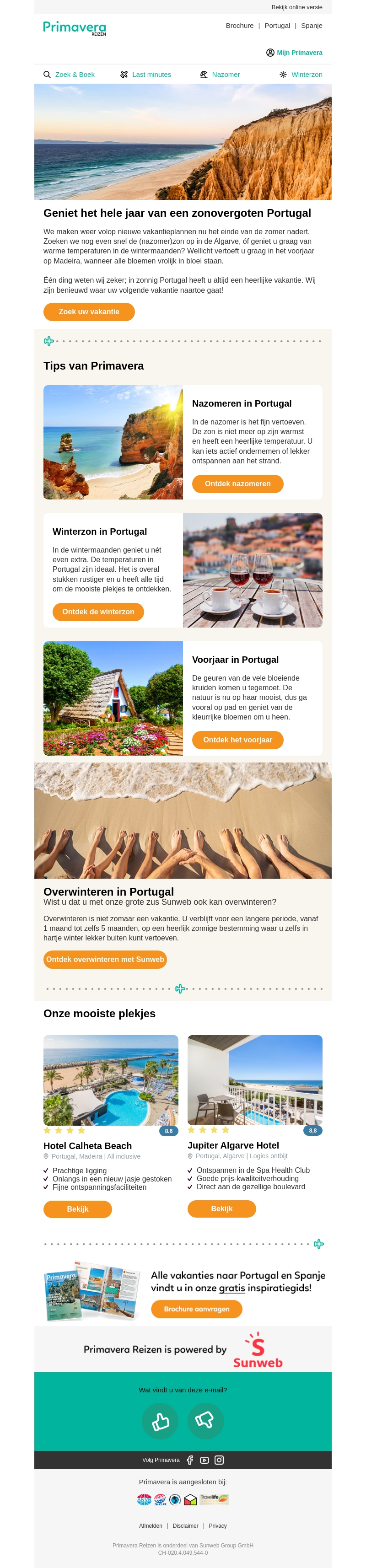 Geniet het hele jaar van een zonovergoten Portugal. Of u nu op zoek bent naar een nazomer, winterzon of een heerlijk voorjaar, Primavera biedt u de beste vakantiedeals. Bezoek prachtige plekken zoals Madeira en de Algarve, en maak gebruik van exclusieve aanbiedingen!