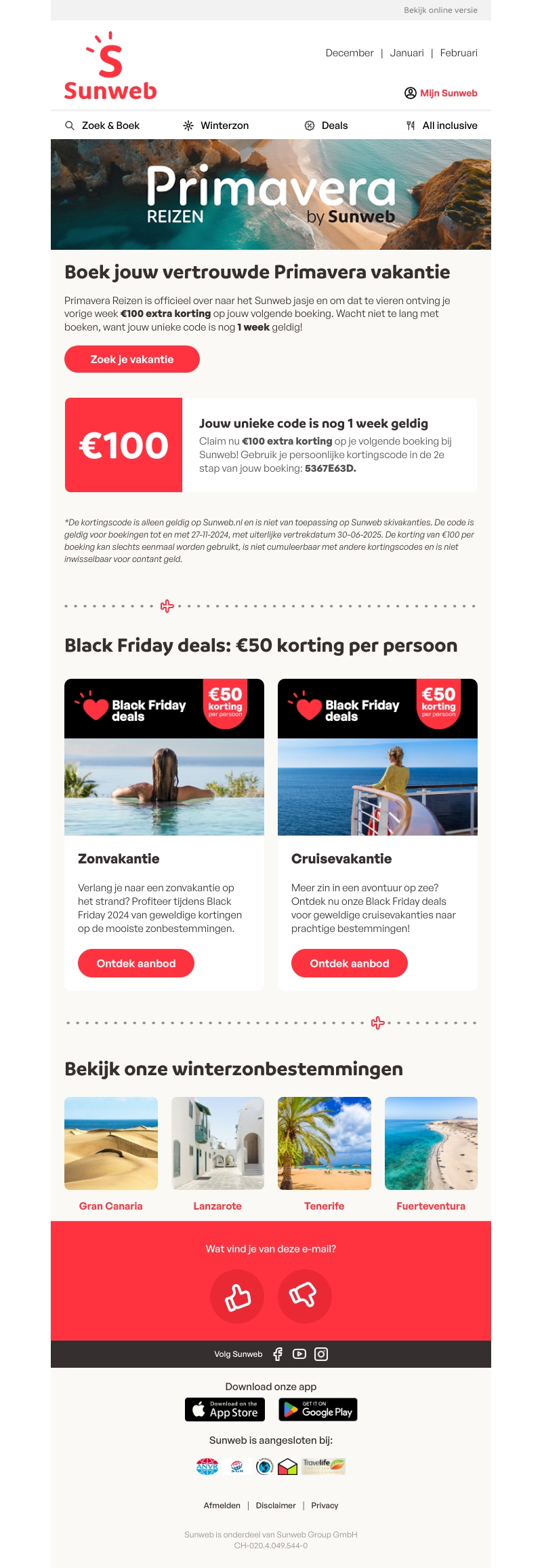 Ontdek de voordelen van een vakantie met Primavera Reizen, nu officieel onderdeel van Sunweb. Met een unieke kortingscode krijg je €100 korting op je volgende boeking. Mis het niet, want de code is slechts één week geldig. Bovendien zijn er speciale Black Friday deals beschikbaar met €50 korting per persoon. Verken winterzonbestemmingen en geniet van extra voordelen.