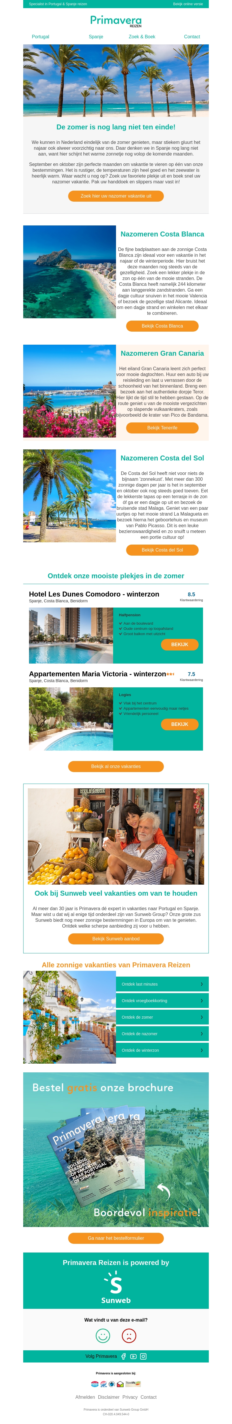 De zomer is nog lang niet ten einde! Geniet van een heerlijke nazomervakantie in Spanje met Primavera Reizen. Verken prachtige bestemmingen zoals Costa Blanca, Tenerife, en Costa del Sol. Boek nu jouw ideale vakantie en geniet van het mooiste weer, uitstekende accommodaties en de beste deals.