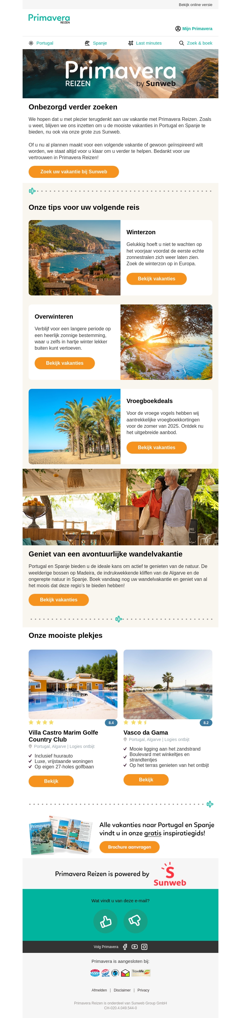 Laat Primavera Reizen u inspireren bij het zoeken naar uw volgende vakantie. Of u nu een winterzonbestemming zoekt of vroegboekdeals wilt scoren voor de zomer, wij hebben wat u zoekt. Bekijk de mooie plekjes in Portugal en Spanje en geniet van een avontuurlijke wandelvakantie in een ongerepte natuur. Ontvang gratis inspiratietips en plan uw reis. Vertrouw op Primavera Reizen voor een zorgeloze ervaring.