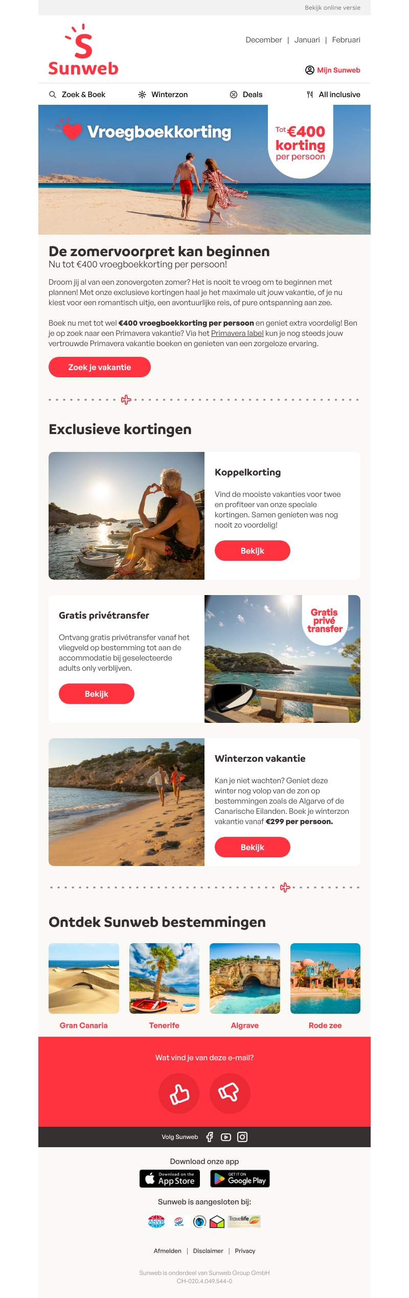 Voel jij al de zomerkriebels? Begin dan nu met het plannen van je zomeruitstapjes met geweldige vroegboekkortingen tot wel €400 per persoon bij Sunweb. Geniet van exclusieve deals en ontdek vakantiebestemmingen zoals de Canarische Eilanden en de Algarve. Boek in de laagseizoen winterzon periode of profiteer van gratis privétransfers. Ontdek de opties en kies voor een zorgeloze vakantie.