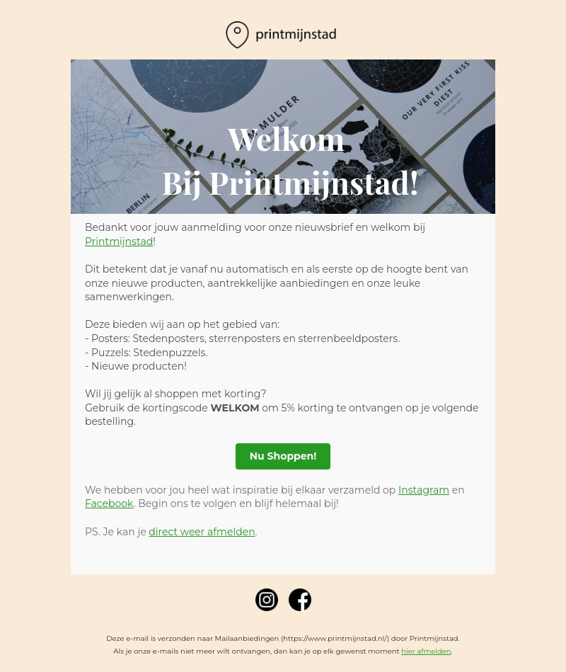Bedankt voor je aanmelding bij Printmijnstad! Ontdek onze nieuwste producten, interessante aanbiedingen en leuke samenwerkingen. Ontvang 5% korting met de kortingscode WELKOM. Volg ons op Instagram en Facebook voor meer inspiratie.