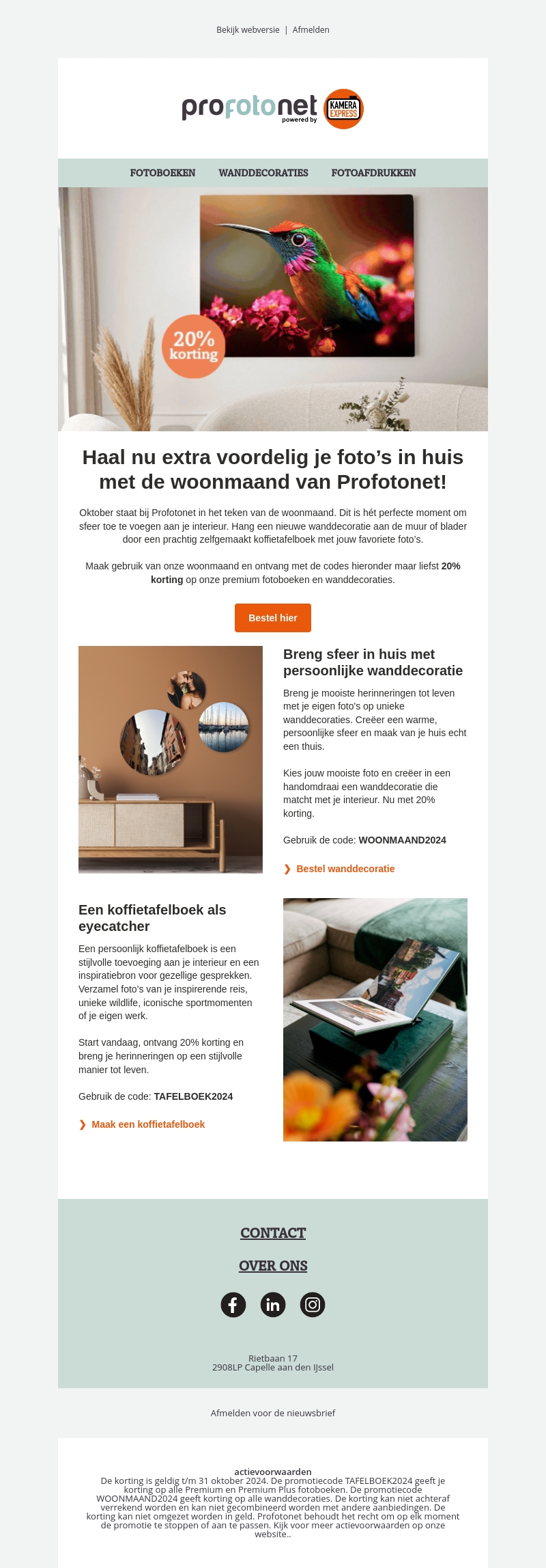 Oktober staat bij Profotonet in het teken van de woonmaand. Dit is hét perfecte moment om sfeer toe te voegen aan je interieur met nieuwe wanddecoraties en fotoboeken. Maak gebruik van onze kortingscodes en bespaar 20%.