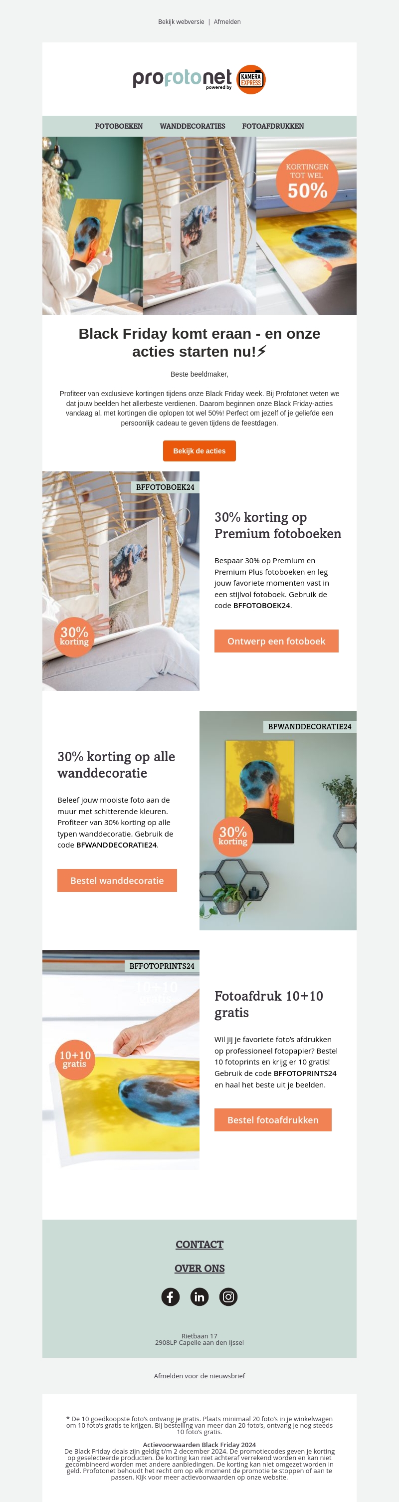 Profotonet biedt exclusieve Black Friday kortingen aan die oplopen tot 50%. Ontdek schitterende deals op premium fotoboeken, wanddecoraties en meer. Gebruik speciale codes zoals BFWANDDECORATIE24 en BFFOTOPRINTS24 om te profiteren van deze aanbiedingen. Mis deze kans niet om je favoriete momenten vast te leggen of cadeau te doen aan je dierbaren.