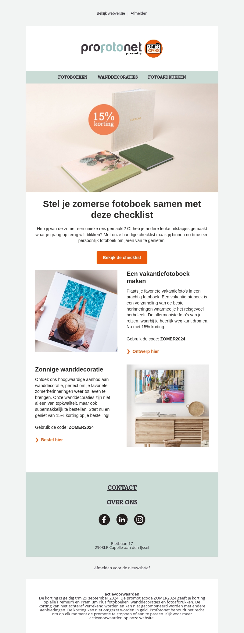 Heb jij van de zomer een unieke reis gemaakt? Of heb je andere leuke uitstapjes gemaakt waar je graag op terug wilt blikken? Met onze handige checklist maak jij binnen no-time een persoonlijk fotoboek om jaren van te genieten! Daarnaast bieden we ook zomerse wanddecoraties met een korting van 15%. Pak je kans en ontwerp nu jouw fotoboek of wanddecoratie.