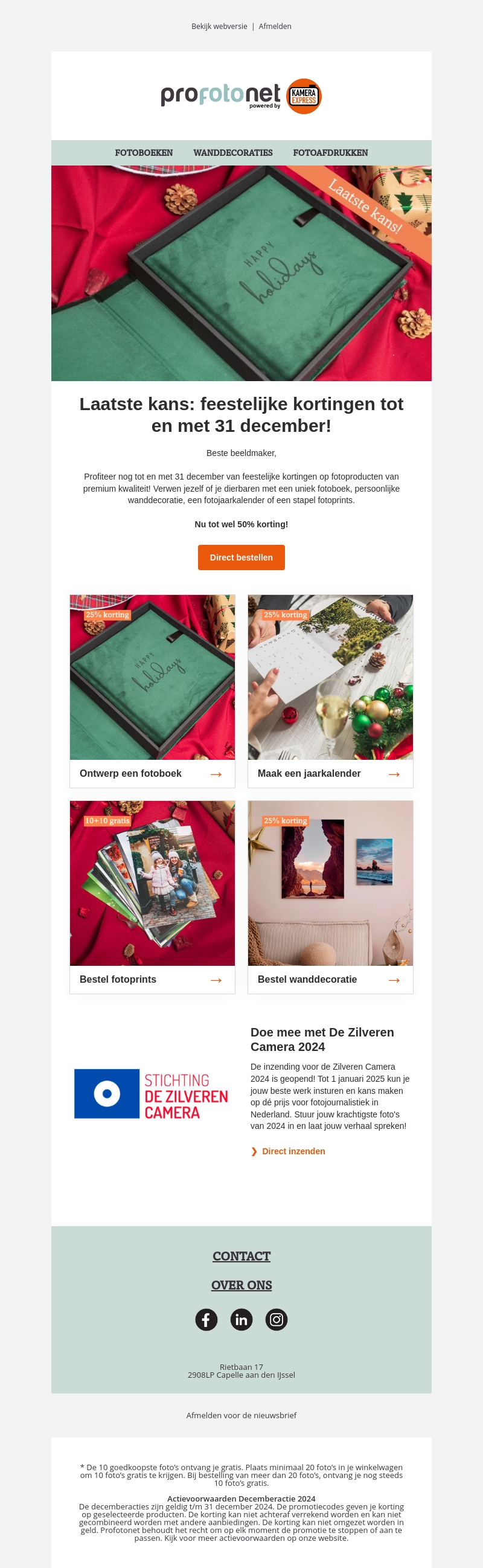 Ontdek de feestelijke kortingen van Profotonet die alleen geldig zijn tot 31 december. Bespaar 50% op hoogwaardige fotoproducten zoals fotoboeken, wanddecoraties en jaarplanners. Grijp deze kans om unieke cadeaus te creëren voor jezelf of je geliefden. Mis deze laatste kans niet en begin direct met winkelen. Bestel snel en geniet van de uitzonderlijke aanbiedingen!