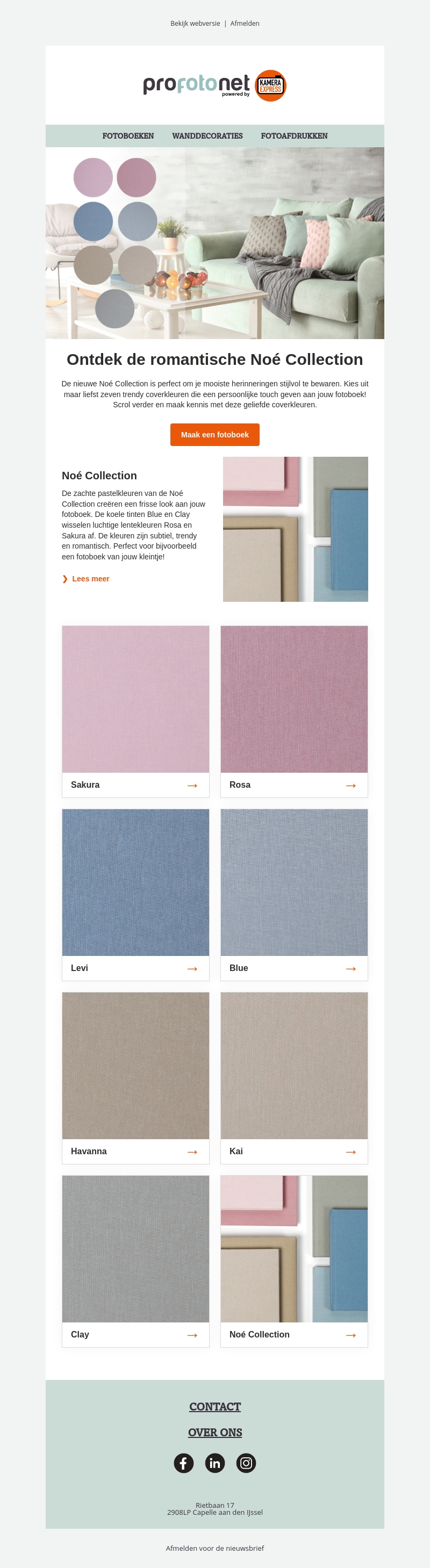 De nieuwe Noé Collection biedt een reeks zachte pasteltinten om je fotoboek een frisse en trendy uitstraling te geven. Kies uit zeven prachtige kleuren zoals Sakura, Levi, en Havanna. Perfect voor je mooiste herinneringen.