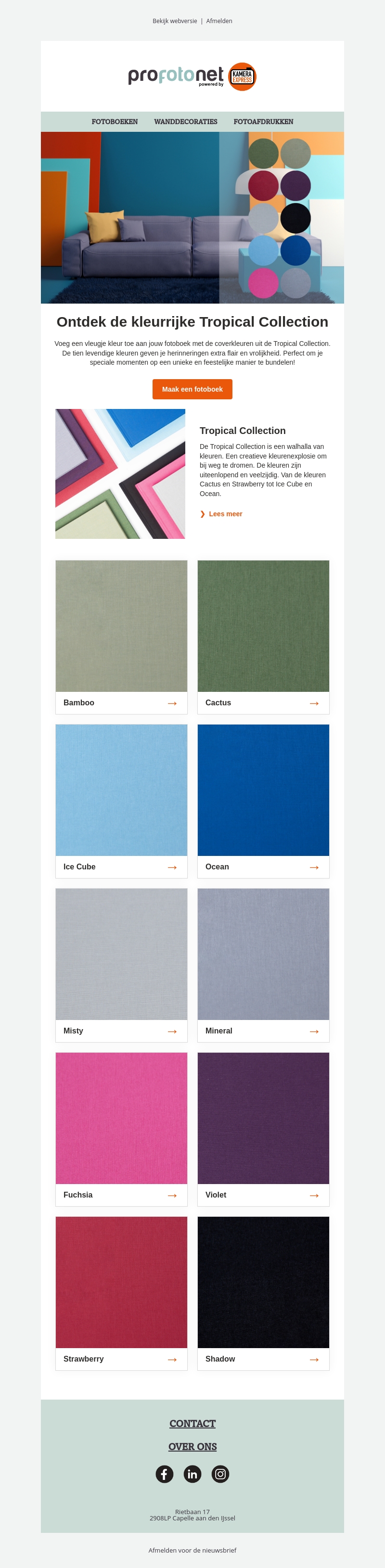 Voeg een vleugje kleur toe aan jouw fotoboek met de nieuwe Tropical Collection. Deze levendige kleuren geven herinneringen extra flair en vrolijkheid. Ontdek de veelzijdigheid van kleuren zoals Cactus, Ice Cube en Strawberry. Perfect om je speciale momenten mee te verbeteren. Kies jouw favoriete tint en maak een fotoboek vol kleur!