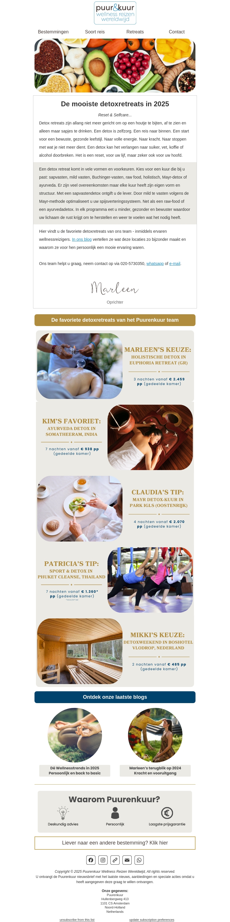Detox retreats zijn perfect voor een complete reset van lichaam en geest. In deze nieuwsbrief ontdek je de favoriete detoxlocaties van het Puur en Kuur team. Van Griekenland tot Nederland, er is voor ieder wat wils. Ontdek de voordelen van sapvasten, Mayr-detox en andere innovatieve methodes. Laat je inspireren voor een gezonder en bewuster leven.