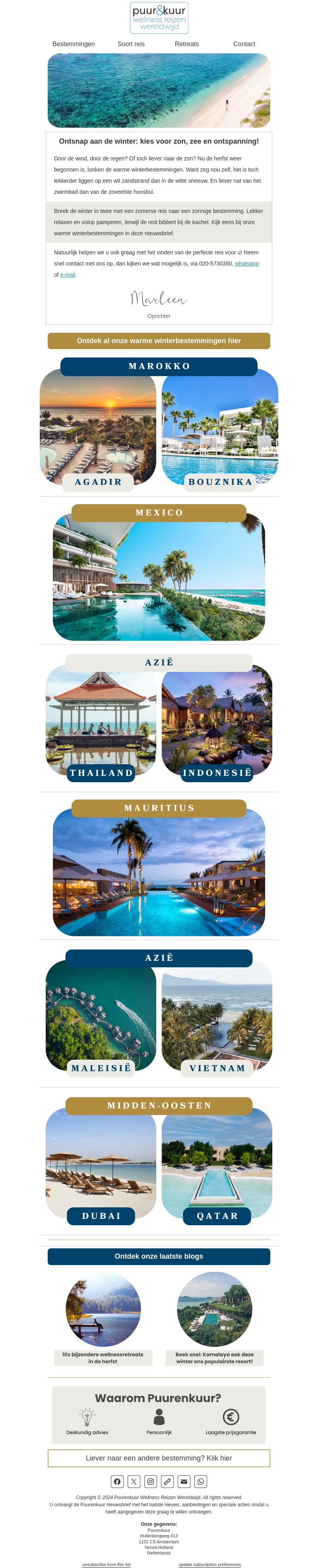 Maak deze winter onvergetelijk met een ontspannen vakantie onder de zon. Verken exotische bestemmingen zoals Marokko, Mauritius en Mexico. Kies voor een wellnessreis en ontspan volledig in een van onze luxe retraites.