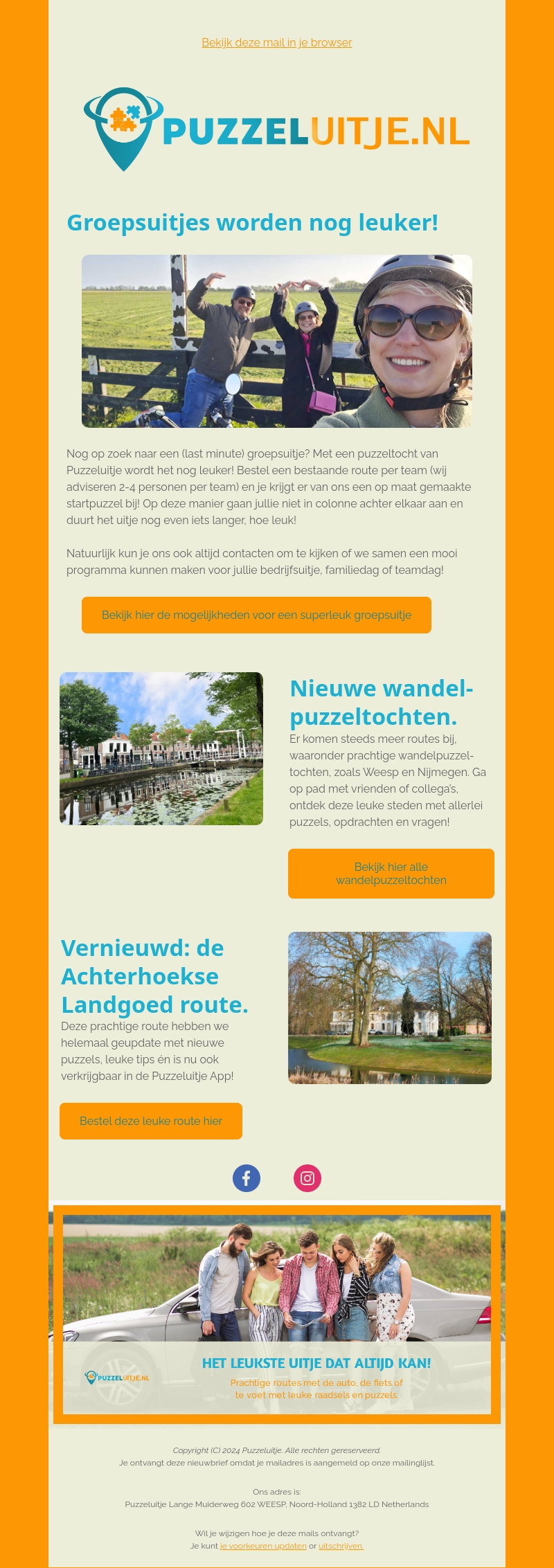 Ben je op zoek naar een leuk groepsuitje? Puzzeluitje.nl biedt spannende puzzeltochten en nieuwe wandelpuzzeltochten aan. Bestel een bestaande route en ontdek mooie steden terwijl je puzzels oplost. Bekijk ook onze volledig geรผpdatete Achterhoekse Landgoed route met nieuwe raadsels. Ga op pad met je vrienden en collega's voor een onvergetelijk avontuur.