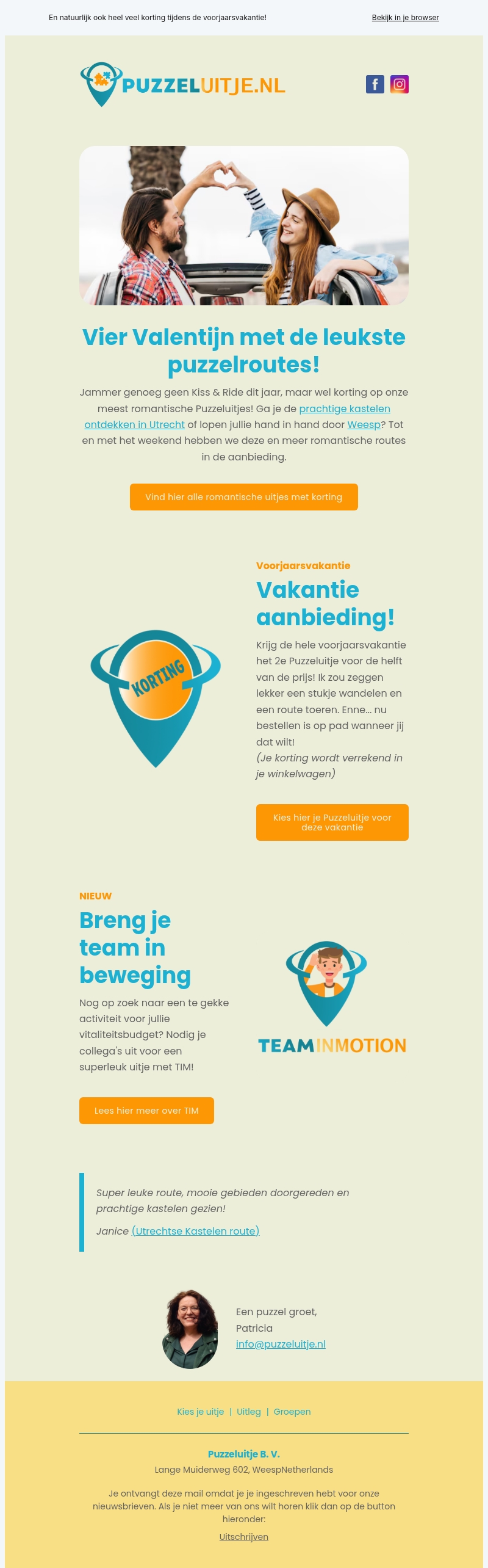 Vier Valentijnsdag met unieke kortingsaanbiedingen op onze romantische puzzelroutes. Kies uit prachtige bestemmingen zoals kastelen in Utrecht en de charmante straten van Weesp. Profiteer van speciale aanbiedingen tijdens de voorjaarsvakantie en beleef een onvergetelijk uitje. Ontdek ook onze nieuwste activiteit voor je team. Mis deze kans niet!