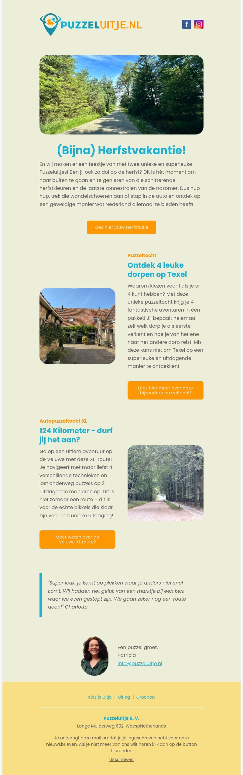 Maak van de herfstvakantie een avontuur met twee exclusieve puzzeltochten van Puzzeluitje. Ontdek vier charmante dorpen op Texel voor een unieke ervaring of waag je aan de 124 kilometer Veluwe XL-route, een echte uitdaging voor avonturiers. Geniet van de schitterende herfstkleuren en de laatste zonnestralen.